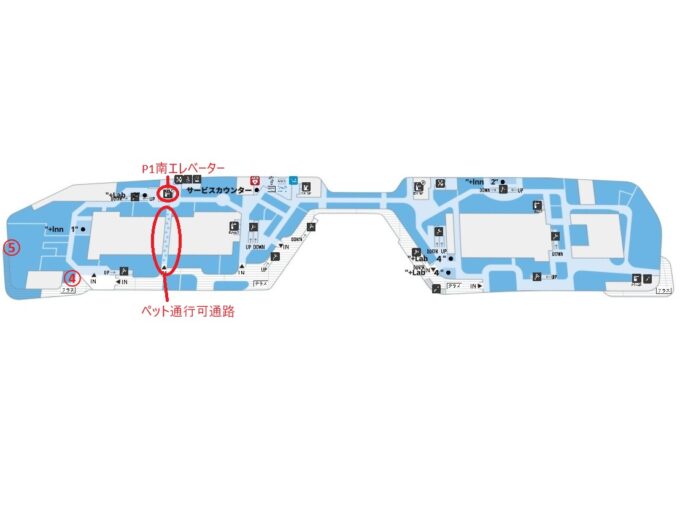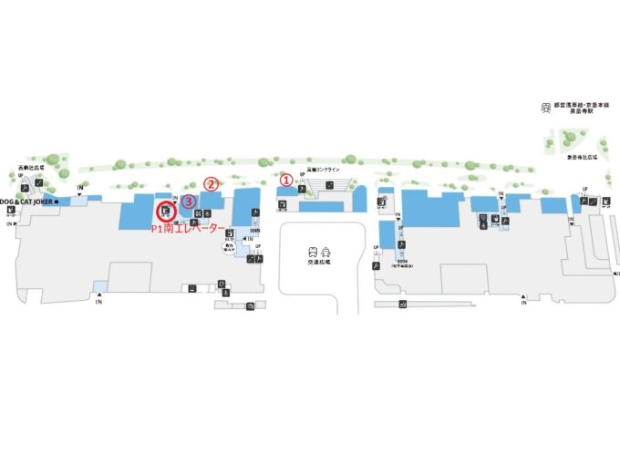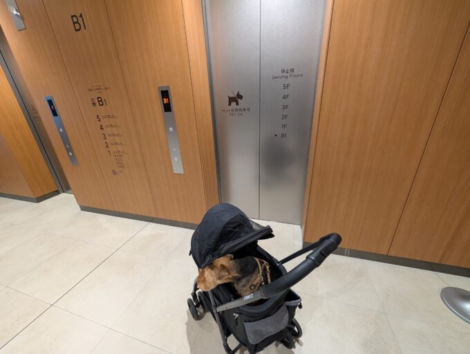 車で行く場合,駐車場はP1北でもP1南でもどちらでも大丈夫です。しかし,エレベーターがペット顔出し可だったり,テラスまでの導線にペット可通路があったりするので,多少遠回りでもP1南に駐車した方が安心です。
